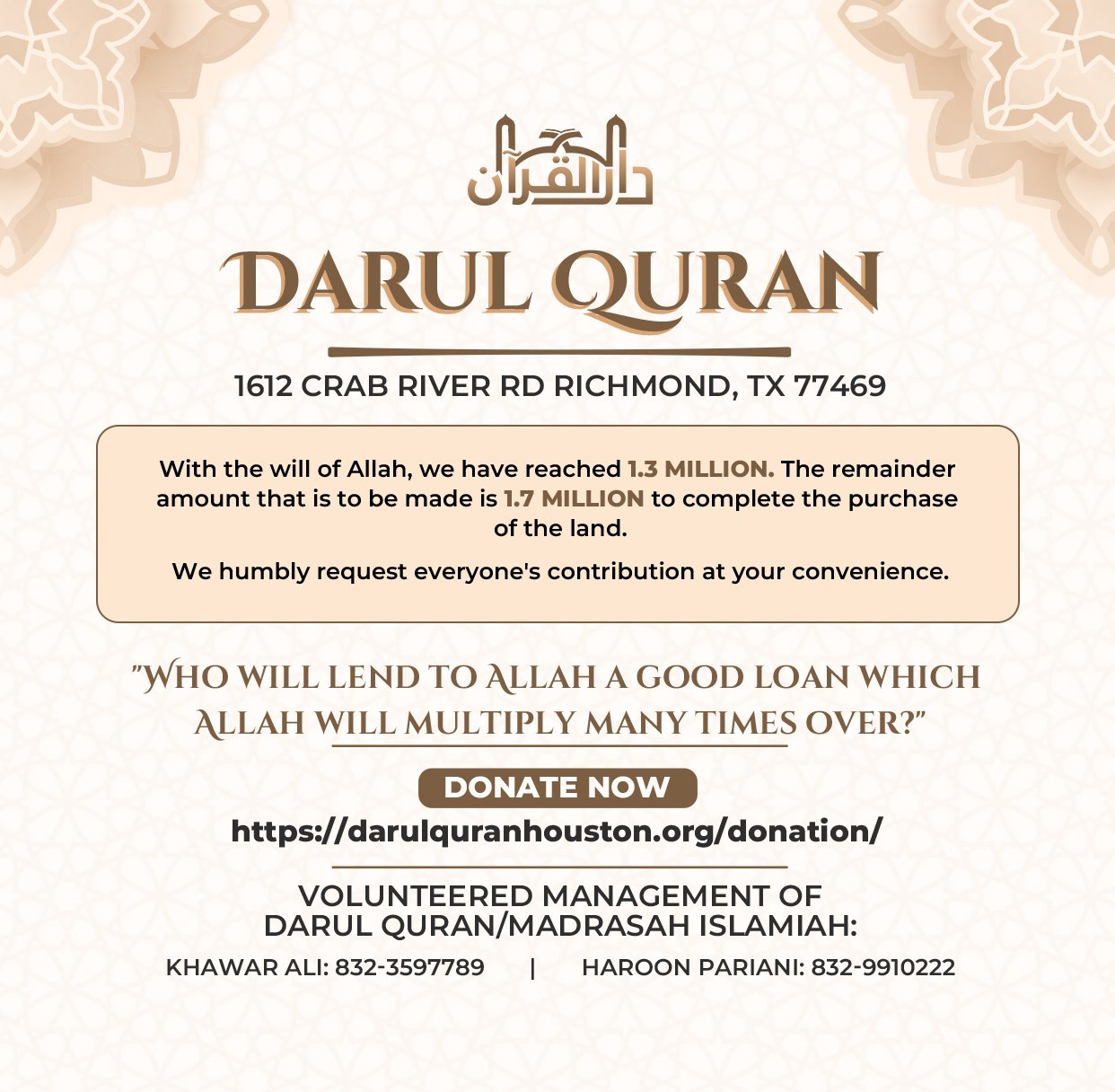 Thankfully, with Allah’s guidance, we were able to find the ideal location after searching for a long time for this purpose (at Richmond, Tx). Currently, we are able to secure the land for the small masjid where we offer daily prayers including Friday prayer and Eid prayer, but we have to purchase full land and for this, we need 3 million dollars.